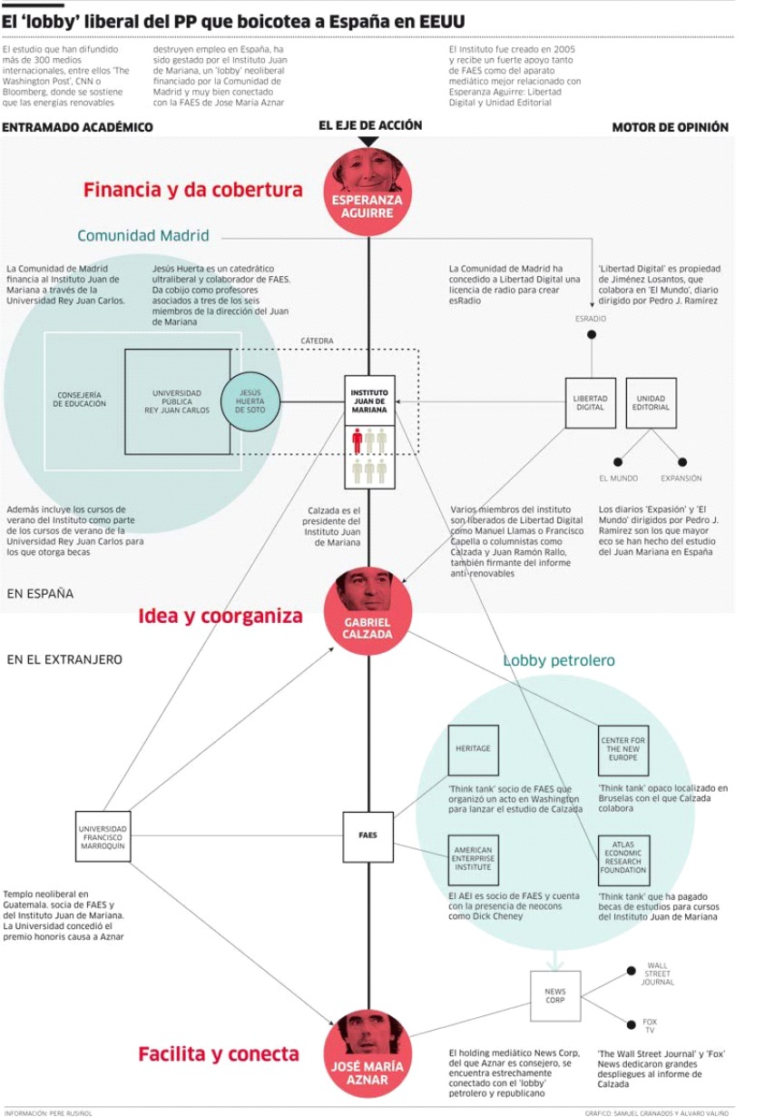 Esta curiosa secta tiene un chiringuito al que llaman “Instituto Juan de Mariana” (del que Rallo es director) que se dedica a difundir su religión económica y que ha creado a su vez otro que llaman centro de estudios superiores ONMA, donde se dedican a impartir cursillos a los que pomposamente llaman másteres y por los que cobran una pasta gansa pero en los que por ningún lado aparece que estén reconocidos por la Agencia Nacional de Evaluación de la Calidad y Acreditación (ANECA). Vamos, como si me pongo a dar yo cursillos desde mi casa de magia y adivinación. Además este “Instituto” Juan de Mariana hay referencias de que ha sido protegido por Esperanza Aguirre, por la Atlas Economic Research Foundation, un satélite de Exxon (de ahí debe venir el negacionismo climático, otra de las señas de identidad de esta gente, que se ve que entiende de todo) o de Koch Industries, perteneciente a la familia Koch, unos millonarios que se dedican a financiar la difusión del ultraliberalismo. Es decir, no estamos hablando de un economista reconocido o de ninguna autoridad, sino de una persona perteneciente a una rama marginada, acientífica y totalmente desprestigiada de la economía pero que el lobby ultraliberal ha convertido en un bluff mediático. Una persona llena de conexiones e intereses con lo más rancio de la política española y con lobbies extranjeros que se dedican a difundir determinada ideología ultraliberal que esconde de forma apenas velada el deseo de implantar un neofeudalismo en nuestra sociedad. En la imagen de más abajo vemos cuáles son los intereses del “Instituto” Juan de Mariana que dirige este supuesto independiente, en un análisis que publicó el diario Público a cuento del escándalo que protagonizó otro de miembros importantes del “Instituto”, Gabriel Calzada, al difundir en EEUU de forma masiva un “estudio” en el que atacaban a las energías renovables.