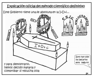 La semana ha terminado con más noticas, negativas, en lo que a investigación se refiere en Hispañistán. El viernes día 25 de enero, El País se hacía eco del nuevo ataque hacia el sistema de investigación, en la forma de reducción de la financiación de proyectos de la convocatoria del Plan Nacional de I+D+i. Tras la noticia que dimos en esta misma página la semana pasada respecto a la revocación de los proyectos de agricultura del Plan Nacional, de la que, curiosamente, ningún otro medio ha dado información, el Ministerio de Economía y Competitividad (sic) ha tomado unas medidas bastante absurdas que acaban por dinamitar, casi definitivamente, la financiación española de la I+D. La “ingeniosa” idea ha consistido, en este caso, en prorrogar el pago de los proyectos de tres a cuatro años, pero manteniendo el calendario de ejecución en tres años. Es decir, los investigadores que hayan tenido la “suerte” de conseguir uno de esos proyectos, tendrán que ejecutarlos en tres años y presentar los resultados, las memorias, y las justificaciones en ese tiempo, pero el último pago lo recibirán un año después. Pero eso no es todo, durante el primer año de ejecución del proyecto, que es cuando más gastos se suelen realizar (contratación de personal, adquisición de reactivos y equipo, etc.), el pago que se realizará no llegará al 10% del importe total del proyecto. Y eso es simplemente inviable. Si los centros de investigación y las universidades tuvieran la solvencia necesaria, se les podría adelantar a los investigadores el dinero, como venía siendo práctica habitual. Pero con las arcas vacías y los presupuestos ajustados al mínimo, eso no es posible. Ni siquiera el CSIC va a poder hacer frente a algo así.