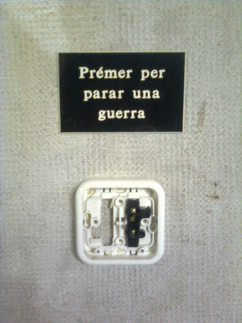 Un ejemplo de ese tipo de pensamiento positivo que acaba siendo mágico, y en el que espero que los lectores reconozcan tantas y tantas iniciativas que nos rodean hoy en día, nos lo brinda otra vez la localidad en la cual resido. Hará un par de años, quizá más, apareció adosado a una pared del Ayuntamiento el interruptor que ven en la foto de arriba, junto con un cartel que dice: “Apretar para parar una guerra”. La verdad es que nunca supe a qué respondía tal montaje; supongo que debe ser algún tipo de performance artística que contaría con el beneplácito del consistorio. Por lo menos, en contraste con lo que describía en el post anterior, esta obra de arte tendría seguramente un presupuesto modesto. Lo que me llamó la atención la primera vez que lo vi fue la ligereza tan estúpida y occidental con la que se trataba un tema tan grave como la guerra. Como si porque alguno de nosotros, apretando un interruptor, tuviéramos el poder de parar alguna guerra en algún rincón ignoto del planeta. Ya me imagino que la intención del creador de este montaje sería más bien hacernos reflexionar sobre la necesidad de tomar una parte activa para detener tantas y tantas guerras que están teniendo lugar en este mundo sin que nuestra opulenta sociedad de aquí se aperciba en absoluto, pero el simbolismo, por más interesante que sea en sí, no puede substituir a la acción. ¿Cuántas veces hemos vistos campañas bienintencionadas como ésta, pidiéndonos firmar o ejecutar de alguna otra forma poco onerosa y de escaso compromiso personal alguna acción de descargo de nuestra conciencia? Estamos tan acostumbrados a estas cosas, tan alienados, que llegamos a creer que estas actividades de pensamiento positivo tienen por sí mismas un efecto real (pensamiento mágico) y no sólo eso sino que además ésta es la única manera de reaccionar delante de estos problemas que nos transcienden en su enormidad. Acaba siendo un recurso facilón: alguien organiza no se sabe muy bien qué, pero que suena a comprometido, a positivo, y como borregos hacemos eso y sólo eso. Es cómodo y es nuevamente una delegación de nuestra ineludible responsabilidad personal a una autoridad demiúrgica infalible, omnisciente y benevolente.
