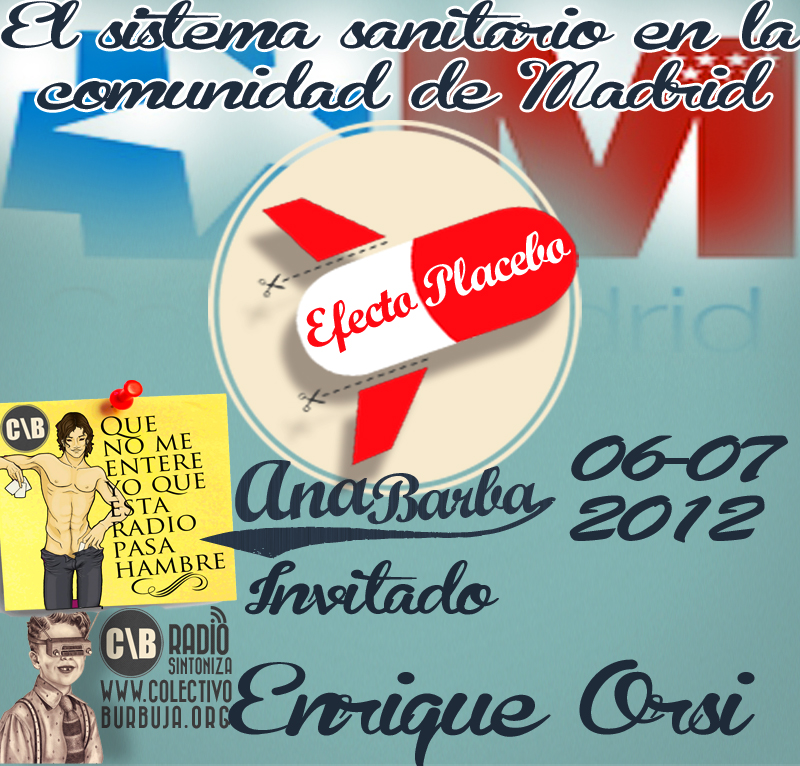 En esta ocasión entrevistamos a Enrique Orsi trabajador de sanitario en la Comunidad de Madrid que no va a ex plicar los intensos recortes sufridos en esta comunidad. Conducido por Ana barba DESCARGA Seguir leyendo Efecto Placebo 06-07-2012 El sistema sanitario en la Comunidad de Madrid