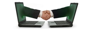 Two facing laptops with an arm emerging from each screen and shaking hands on a white background