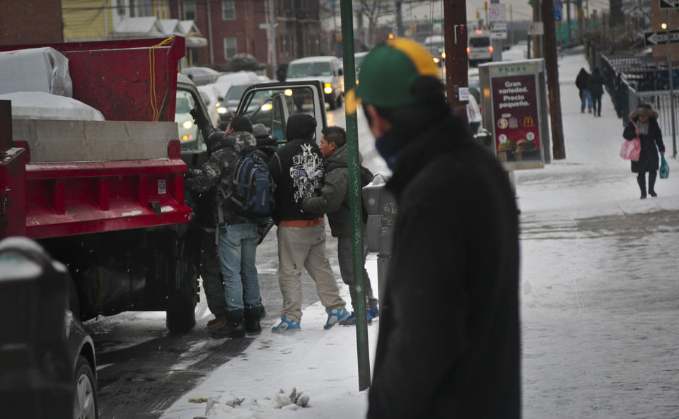 Varios jornaleros se apresuran a subirse a la camioneta de un contratista en una esquina de Queens, Nueva York, el 17 de diciembre del 2013.