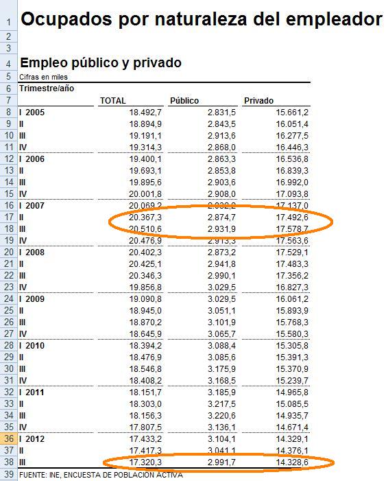3.- El número de trabajadores del sector privado se ha reducido casi en un 20% pero el de empleados públicos es un 2% mayor.