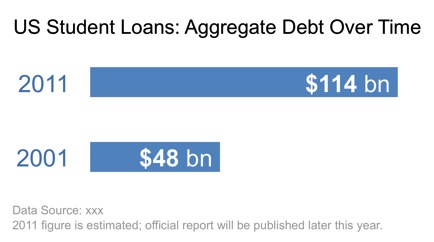 Deuda acumulada de los estudiantes en 2001 y 2011 en Estados Unidos (imagen) , tras ella, gráfico interactivo mediante el que puede discriminarse la búsqueda de universidades por volumen de estudiantes y/o porcentaje de los mismos en la quiebra por no poder devolver sus préstamos para cubrir su educación.