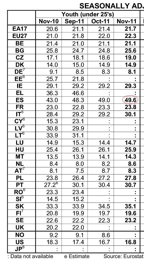 Eurostat ha publicado los datos de noviembre de desempleo, desestacionalizados. España sube hasta el 22.9% en desempleo total, muy por delante de cualquier otro país europeo.
