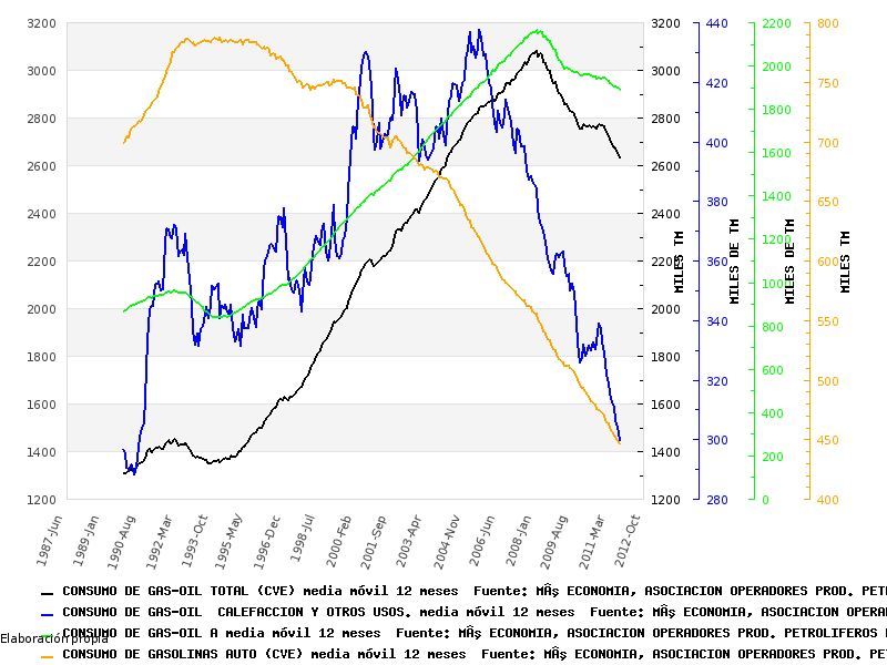 Consumos per cápita desde 1989. En gasóleos totales estamos hablando de que la crisis ha provocado ya un descenso de casi el 18%, llevándonos a niveles de principios de la década pasada.