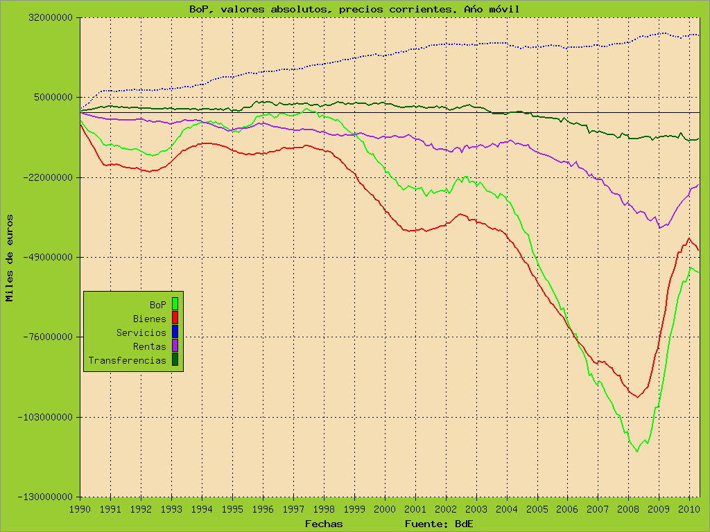 -Estos deterioros quedan parcialmente compensados por la mejoría en la balanza de rentas, desde 2.941 millones a 2.088 y la de transferencias, que refleja un superávit de 195 millones frente a un déficit de 438 milliones en 2009. Como el BdE no ofrece los datos desglosados más que trimestralmente, es difícil saber las razones, pero probablemente obedezca a unas menores plusvalías de las inversiones extranjeras en España y a una disminución de las remesas de los emigrantes. También a una mejoría de los resultados de las inversiones españolas en el exterior. Sin embargo, debemos recordar que las mejorías en estas balanzas, aunque pueden ayudar a superar una situación puntual difícil, no reflejan ningún tipo de mejora en la competitividad, nuestro gran caballo de batalla.