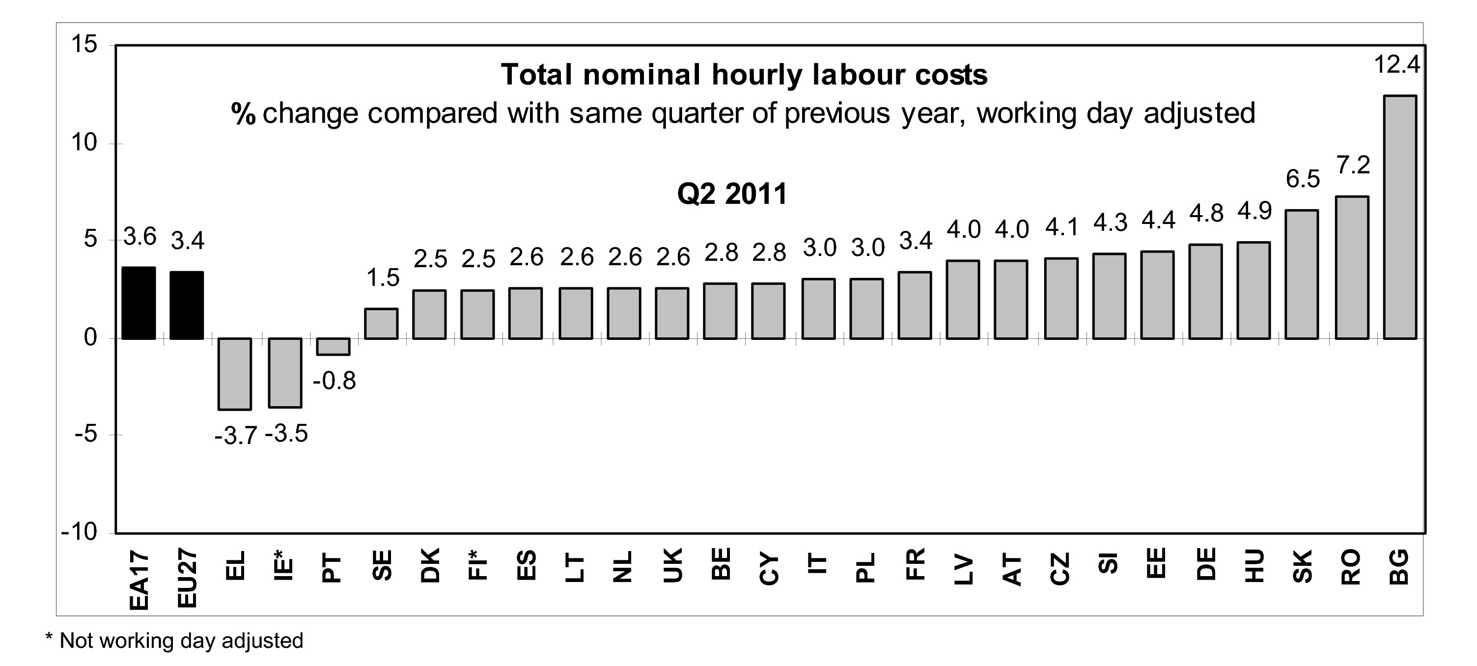 Gráfico de la evolución de los costes laborales horarios en Europa en el último año. En la teoría clásica se supone que rebajando los salarios se conseguirá que las economías de los periféricos se reequilibren. Como vemos, el proceso está en marcha en Grecia e Irlanda, y está empezando en Portugal. En Italia y en España no ha comenzado, lo que nos puede dar una idea de los padecimientos que nos esperan.