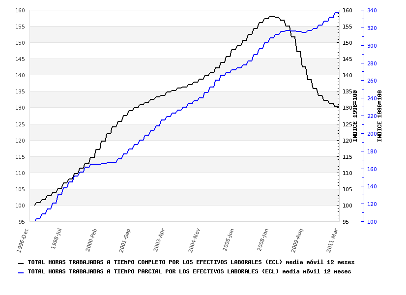 Este aumento del empleo a tiempo parcial técnicamente se considera subempleo, ya que muchas son personas que desean trabajar la jornada completa y sólo encuentran trabajo a tiempo parcial. En el gráfico se puede ver cómo el empleo a tiempo completo ha seguido cayendo –de hecho se encuentra a niveles de 2001–, mientras que el empleo a tiempo parcial ha seguido aumentando. Desde el primer trimestre de 2007, según la Encuesta de Coyuntura Laboral, el empleo asalariado a tiempo parcial ha aumentado un 15,6%. Al ser la jornada a tiempo parcial promedio aproximadamente el 50% de la jornada normal y ser los asalariados a tiempo parcial alrededor del 15% del total de trabajadores, eso implica que por esta vía el paro obtenido en la EPA es unos dos puntos porcentuales menor que el real. Eso quiere decir que nuestra auténtica tasa de paro ya debe ser superior al 23%.