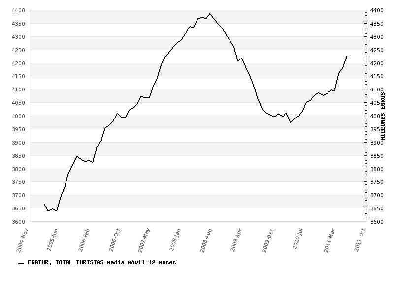 Hoy hemos conocido los datos de la Encuesta de Gasto Turístico (EGATUR) de junio, que estima el gasto de los turistas extranjeros, y que ha mostrado una magnífica recuperación respecto al mismo mes de 2010 (+10.2%). El primer semestre del año se cierra con una excelente subida del 8.5%. En el gráfico suavizado se aprecia la excelente tendencia que presenta el sector ahora mismo.