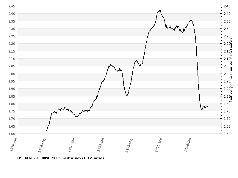 La actividad industrial se encuentra instalada en niveles pre-burbuja (1997), aunque si corregimos en función del aumento de la población, en realidad la producción industrial per cápita está en niveles de finales de los años 70 del pasado siglo.
