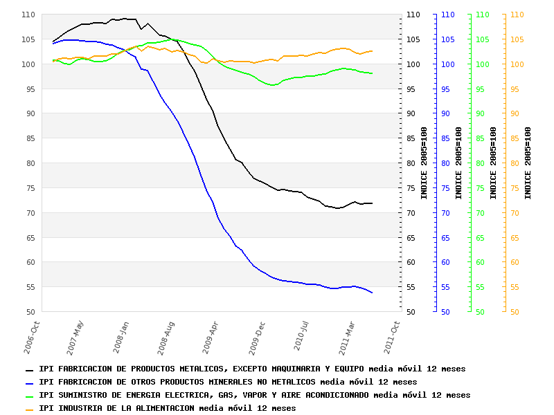 Los otros dos sectores que se representan en el gráfico (productos metálicos y productos minerales no metálicos) sufren descensos brutales desde el principio de la crisis.