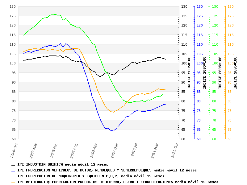 Los otros tres sectores (automóvil, metalurgia y otra maquinaria) tienen niveles de actividad mucho más bajos que los previos a la crisis, aunque en los tres casos existe una recuperación de leve a moderada desde los mínimos de 2009 que todavía continúa.