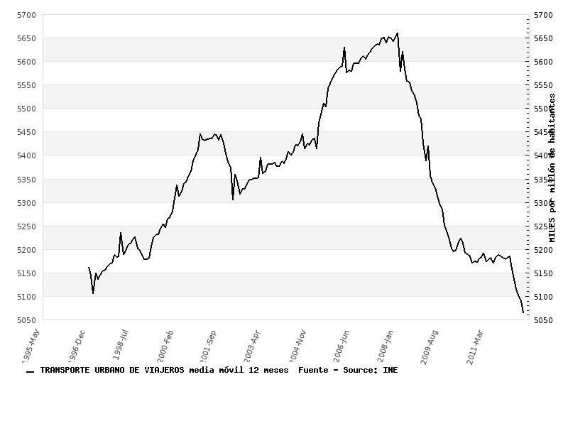 Esto lo podemos ver en el gráfico de utilización del transporte urbano colectivo por millón de habitantes, que ha pasado de un promedio de 5,66 viajes por persona y mes en el pico de la burbuja a 5,06 en estos momentos, por debajo de los 5,16 de 1996 (inicio de las series estadísticas), siempre hablando de medias de los últimos doce meses (año móvil).