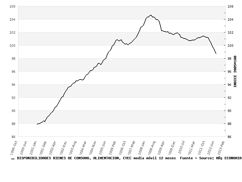 Una pista la podemos encontrar, tal vez, en el indicador de disponibilidades interiores de alimentos, que nos habla del consumo aparente de alimentos dentro de España. Esto lo vemos en el siguiente gráfico. Obsérvese que, al igual que ocurre en el transporte urbano de viajeros, en febrero de este año empieza un acusado y extraño descenso, en este caso peor que el de 2008-2009.