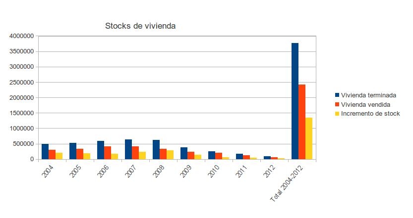 También llama la atención los enormes incrementos de stock que año tras año se acumulaban durante la cúspide de la burbuja, sin duda fruto de una locura colectiva típica de estos procesos especulativos en que a los productores no les importa acumular stock pues éste es una fantástica inversión al revalorizarse año tras año a tasas de dos dígitos. Por lo tanto es de suponer que el comportamiento en años anteriores a 2004 debió de ser muy similar al de ese año, y que por lo tanto ese ritmo de acumulación de unas 200.000 viviendas/año de stock tuvo que suceder en años anteriores a 2004 y desde el inicio de la burbuja (1999). Si esta suposición es correcta el stock sin vender al comenzar 2004 es muy probable que fuera bastante superior al millón de viviendas, con lo que el total a fecha de hoy de vivienda sin vender seguramente ronde los 2,5 millones.
