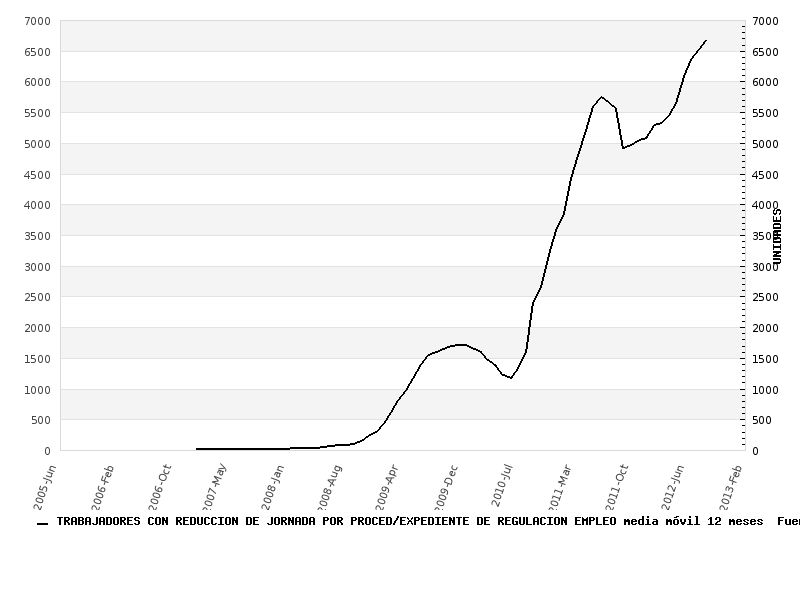 Se está produciendo un aumento del trabajo a tiempo parcial que está sirviendo para amortiguar aunque sólo sea de forma incompleta los efectos sociales de esta nueva oleada de destrucción de empleo en un país ya asolado por la crisis. En los siguientes gráficos se aprecia la diferencia en la evolución en el empleo a tiempo completo y a tiempo parcial y el aumento en los ERE de reducción de jornada. De hecho en casi ningún trimestre a lo largo de la crisis el empleo a tiempo parcial se ha reducido y en este último incluso ha aumentado ligeramente. Como se ve claramente en el gráfico los ERE de reducción de jornada están en máximos, con un promedio de 6.680 trabajadores afectados por mes en los últimos doce meses. Sin embargo, y aunque está claro el efecto de los ERE, éstos no pueden explicar más que una parte del aumento del trabajo a tiempo parcial que son, según la EPA, 90.000 personas más en el tercer trimestre de 2012 que un año antes. Si sólo existiera el efecto de los ERE, y a igualdad de otros factores, el trabajo a tiempo parcial debería haberse reducido en unas 60.000 personas. Por lo tanto, está claro que está produciéndose un aumento de este tipo de empleo que seguramente responde a factores como la reducción de jornada de mutuo acuerdo y fuera de este tipo de expedientes y la creación de nuevos empleos a tiempo parcial (que a veces pueden ocultar fraudes a la Seguridad Social a ser realmente a tiempo completo).