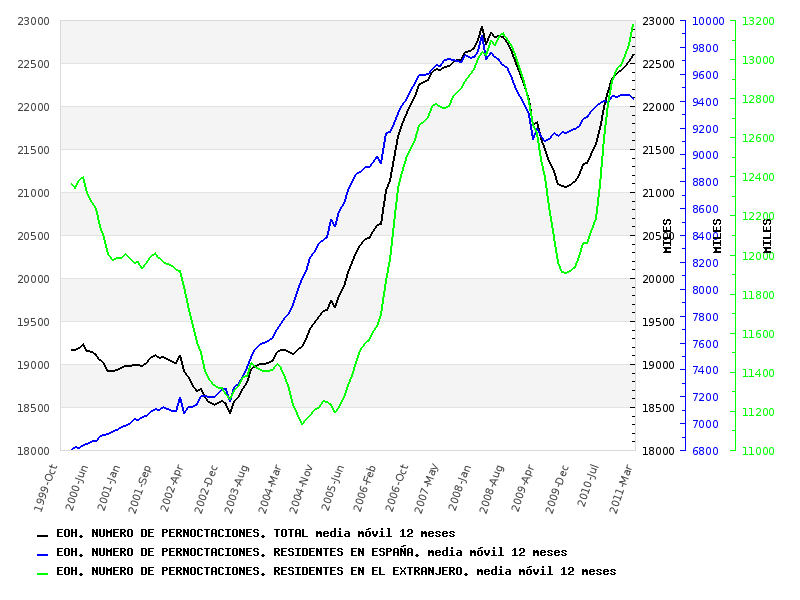 Los datos de pernoctaciones hoteleras en el mes de marzo nos deja un sabor agridulce. A veces las desgracias de unos son las alegrías de otros, y así ha ocurrido con el turismo extranjero, que en los últimos meses daba sńtomas de debilidad y que sin embargo en marzo ha acelerado las tasas de crecimiento. Esto se debe a la crisis social en el Norte de África, que ha desviado muchísimos turistas europeos a otros destinos. El elegido con preferencia ha sido España, lo que se ha traducido en una tasa de incremento interanual en las pernoctaciones del 13.5%, la mayor en siete meses.