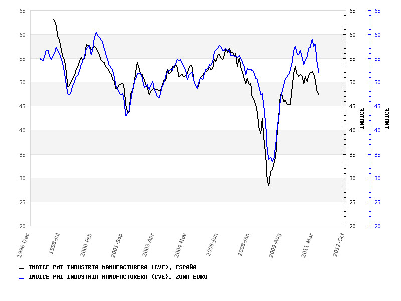 Como ya veníamos viendo en los datos del PMI manufacturero, era ya claro que la industria, lastrada por la débil demanda interna, estaba ya seguramente en recesión. En el gráfico se puede ver cómo el índice en España ha bajado de 50 en mayo y junio (nivel que indica contracción de la actividad). La recuperación desde los calamitosos niveles de 2009 fue siempre mucho más débil en España que en la UE, ya que la demanda en España nunca llegó a recuperarse, y por lo tanto la industria sólo entró en terreno débilmente positivo gracias a la demanda externa.