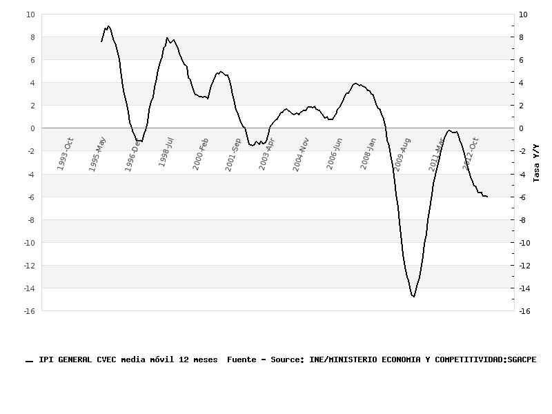 A pesar del discurso de recuperación (faltan dos meses para la prometida remontada y no parece que llegue), el IPI sigue para abajo poco a poco. La caída media de los últimos 12 meses acaba de bajar por primera vez desde junio de 2010 del 6%. Me va a perdonar Mariano, pero lo que veo no es recuperación, sino un amago de estabilización en la velocidad que ha alcanzado este avión en barrena que es la economía española.