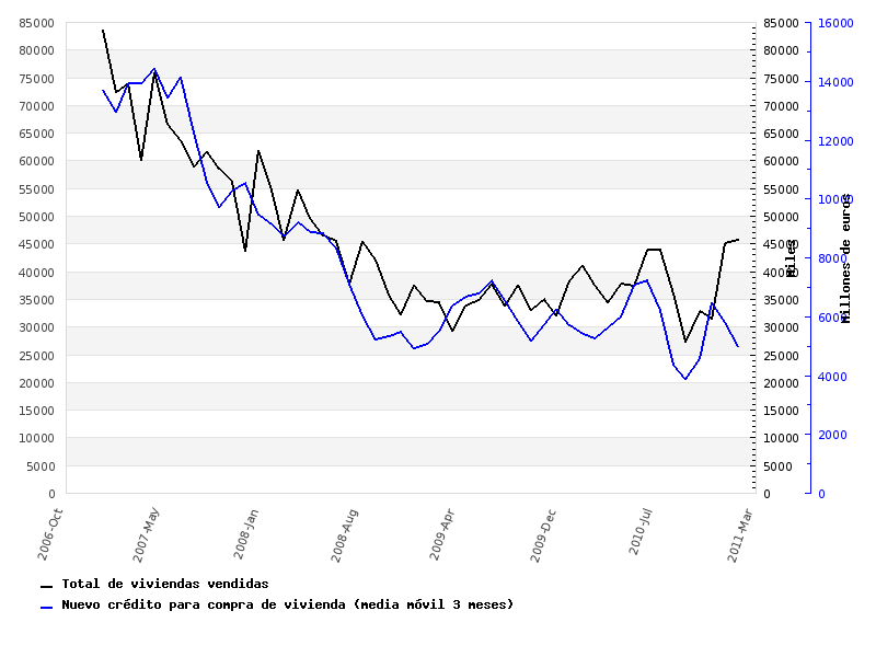 Los números de las estadísticas de compraventas de viviendas en febrero han sorprendido por ser los mejores desde junio de 2008, concretamente 45.607. Esto es mucho más de lo esperado por mi, que en función del desplome del crédito para vivienda en enero preveía una cifra en el entorno de las 35.000 viviendas.
