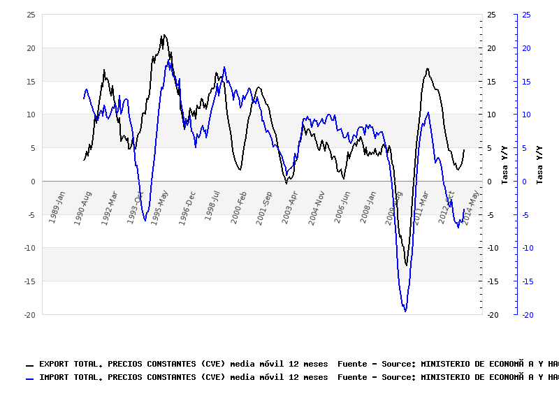 Vuelven a aumentar las exportaciones, tras un excelente mes de abril. Las importaciones también caen con más lentitud, lo que es reflejo de la suavización de la caída de la demanda interna.