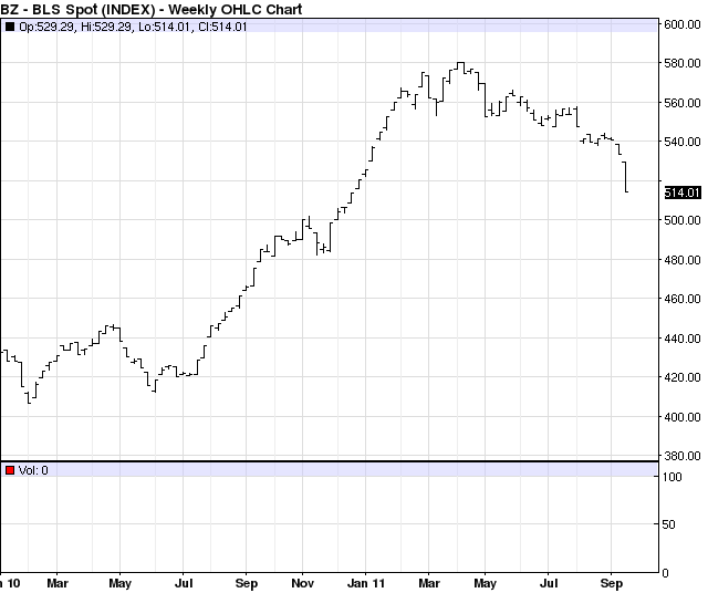Después de unos meses en que se observó un lento declinar, finalmente las materias primas parecen haber iniciado una decidida caída, como se ve en el gráfico del índice CRB para compras al contado, que ha recuperado los niveles de principios de año.