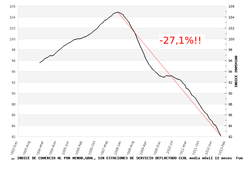 En primer lugar veamos lo que ha pasado con el comercio en los últimos cinco años. En el gráfico podemos apreciar cómo éste ha decaído nada menos que un 27,1%, siendo lo más preocupante que la caída en estos momentos es más grave que durante la media del período.