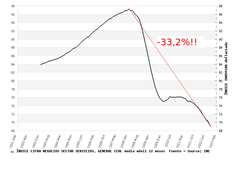 Escuchando lo que dicen los políticos y ciertos datos económicos que son los más aireados (especialmente el PIB, que baja sólo 5 puntos desde el inicio de la crisis) podría pensarse que lo que está ocurriendo en España es una recesión sin más, y perfectamente asimilable a la de otros países. Nada más lejos de la realidad. En Francia, por ejemplo, la actividad de los servicios se halla en estos momentos sólo un 2% por debajo de la de 2007, mientras que el índice de comercio minorista está un 8,6% por encima. Los datos españoles nos están dando una imagen bien distinta, una imagen de gravísimo declive en los estándares de vida como probablemente no se ha visto en ningún país avanzado en los últimos 100 años, en período de paz. Una imagen que coincide plenamente con la percepción de la gente que vive y lucha a pie de calle y no vive en la torre de marfil de unos despachos situados en Moncloa, en los ministerios, ayuntamientos o consejerías.