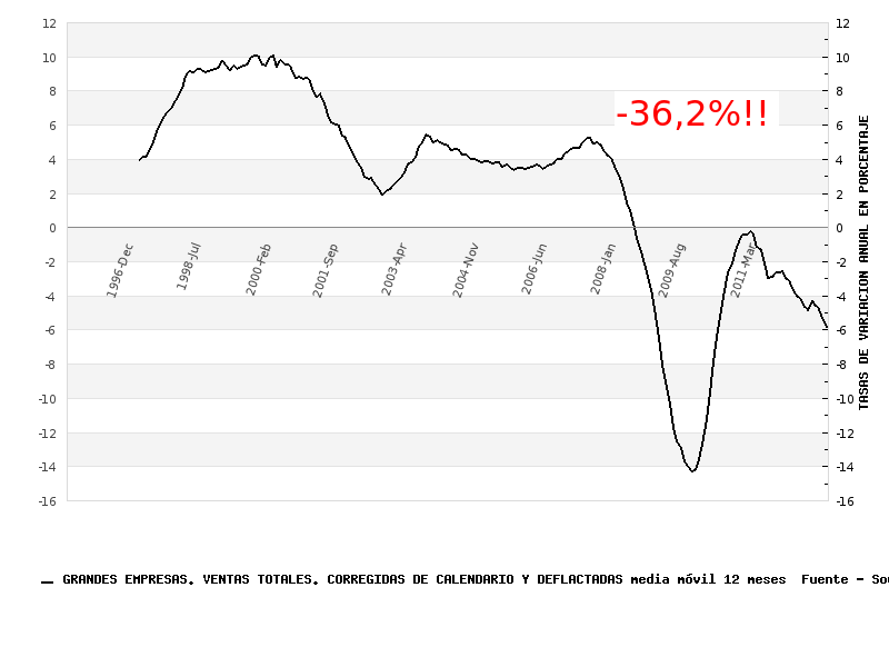 Las ventas interiores de las grandes empresas, que suponen más de la mitad de la actividad económica del país, han tenido una evolución aún peor, en concreto bajan un 36,2% desde 2007. Hay que destacar que en este caso no se trata de encuestas, sino de datos totales compilados por la Agencia Tributaria. La situación en el último año se ha agravado sobremanera, y especialmente desde la subida del IVA.