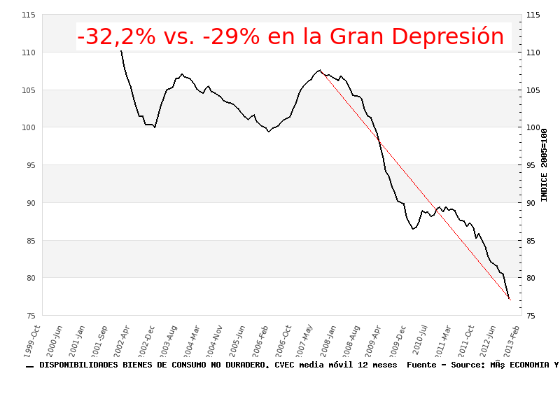 Existen también agregados que miden el consumo dentro del país, que es lo que vamos a ver ahora. El primero de ellos son las disponibilidades interiores de bienes de consumo no duradero (menos de tres años de vida útil), que se hunden un 32,2% desde 2007.