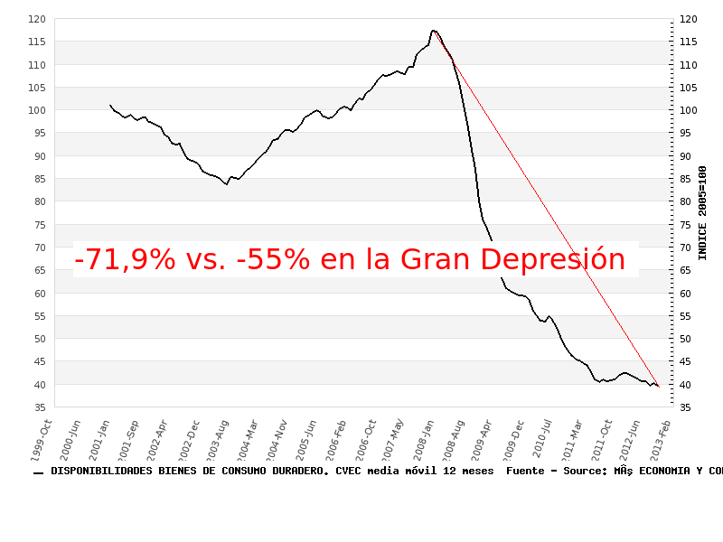 En cuanto al consumo de bienes duraderos, la situación es mucho peor, habiendo bajado un 71,9% desde 2007.