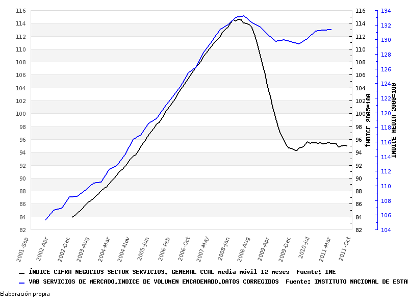 PIB de servicios de mercado (INE) vs. índice de actividad del sector servicios (INE).
