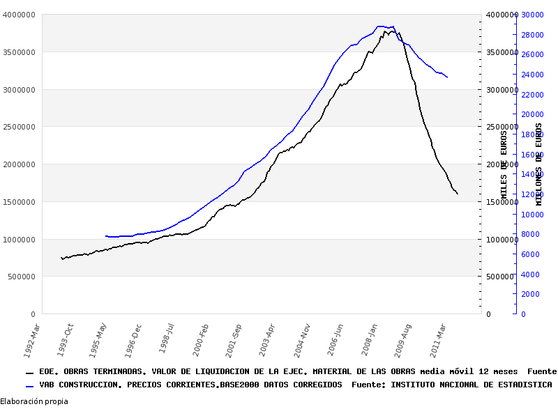 PIB de la construcción (INE) vs. valor de liquidación de las obras terminadas (Fomento).
