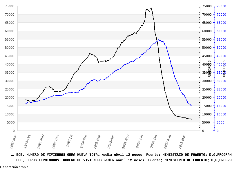 Ahí es nada. La actividad de construcción de vivienda nueva perfora todos los suelos conocidos (que no por conocer) y baja un 93% respecto a los máximos de la burbuja. Las obras terminadas siguen por encima de las viviendas nuevas vendidas, luego mientras entramos en el quinto años de nuestra Gran Deperesión el brutal stock de viviendas se sigue incrementando mes tras mes, debido a la colusión de regulador, banca y constructoras para ocultar las situaciones de quiebra.