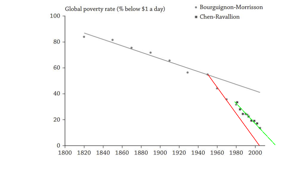 1. El el gráfico se ve que desde la segunda guerra el ritmo de reducción de la pobreza es mucho mayor que antes. Las dos curvas verde y roja son casi iguales (además de que la roja está hecha con 3 puntos, no se puede saber el ritmo de reducción exacto, solo que se reduce). Y en ese periodo lo que ha imperado es el capitalismo. Si lo que querías mostrar es que el capitalismo no reduce la pobreza, ese gráfico muestra lo opuesto ¿?