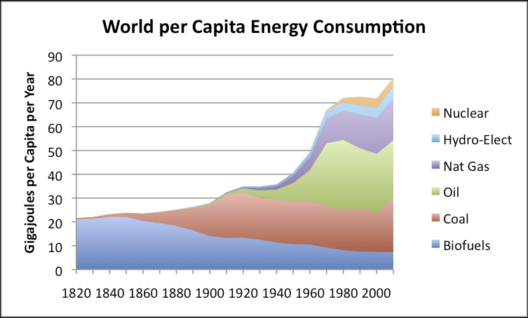 Como vemos desde 1820 hasta 1945 este consumo aumentó con lentitud, mientras que a partir de esa fecha, por la incorporación masiva del petróleo a los procesos productivos, el consumo de energía se disparó. Este aumento a partir de 1973, con la primera crisis del petróleo, se ha hecho mucho más lento, y a ello pienso que se debe atribuir en parte la reducción más lenta de la pobreza. Durante los “30 gloriosos” (1945-1973) si no hubo una disminución mucho más acusada de la pobreza se debe a que el crecimiento se centró básicamente en el mundo rico (donde ya había pocos pobres) mientras que si desde 1973 no ha sido mucho más lenta es porque el crecimiento se ha centrado sobre todo en países donde había muchos pobres. El que esto último haya ocurrido por las políticas liberales es bastante dudoso, siendo bastante más probable que la contribución de la liberalización del comercio o de la inversión extranjera haya sido un factor secundario mientras que la implantación de gobiernos en muchos países con conocimientos mucho más sólidos de qué políticas hay que aplicar para que la economía crezca es probablemente mucho más importante.