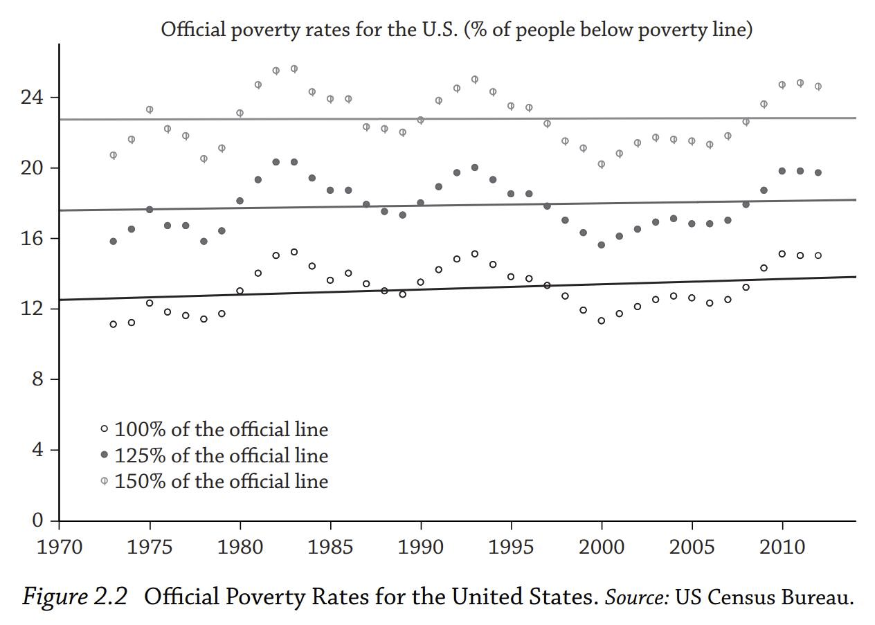 2. Por empezar por el final (dejo lo mejor para luego), el Sr. Barba dice que en los países ricos la pobreza y la desigualdad han aumentado. Pero para demostrarlo no da los datos de pobreza y desigualdad de la OCDE (por ejemplo), sino que coge una muestra de dos países, seleccionada con el cherry picking más descarado. Y encima ni con eso demuestra el punto. En la gráfica de EEUU ni si quiera se ve que la pobreza aumente, sino que está estancada (y además esta gráfica no expresa exactamente eso). Esta gráfica sí es la de la pobreza en EEUU: