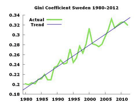 Lo que sí que hemos visto desde los años 80 del siglo XX es un progresivo deterioro de los niveles de igualdad y de pobreza relativa en muchos países ricos. Solo pondré dos gráficos. En el primero vemos el aumento de la pobreza en EEUU en las últimas décadas. Y en el segundo cómo la sociedad paradigma de la igualdad, Suecia, ha ido empeorando su índice de Gini (que mide precisamente esto).