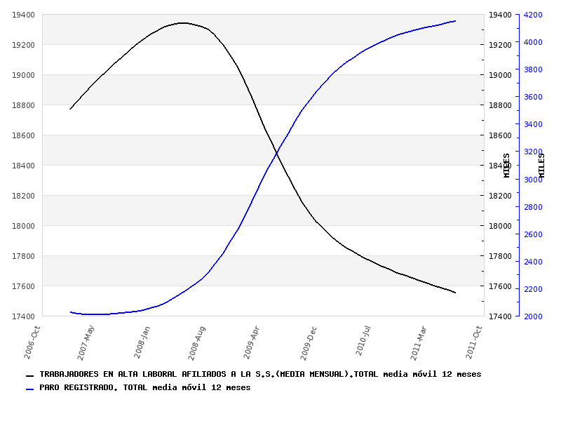 Existen varios métodos para realizar esto. El más simple es utilizar el “año móvil”, es decir, que en cada mes se utiliza la media de los últimos 12 meses. Si hacemos esto y representamos en un gráfico los datos de afiliación a la Seguridad Social (empleo) y paro registrado desde 2007, nos encontramos con que no ha habido absolutamente ninguna mejoría en los últimos meses. El empleo sigue cayendo y el paro sigue aumentando.