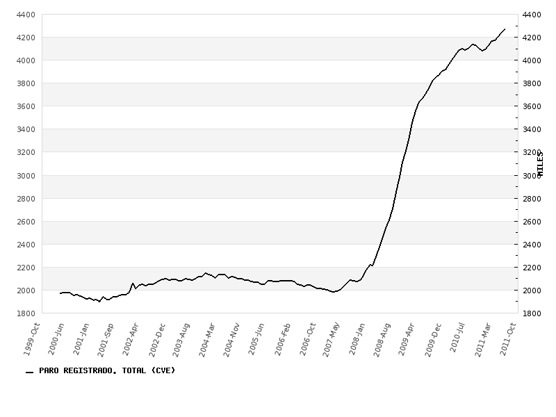 El Ministerio de Economía publica también los datos de paro registrado desestacionalizados. Éstos muestran igualmente cómo el paro sigue creciendo, ya que el aumento en julio ha sido de 29.630 parados más respecto a junio y de 180.260 respecto a julio de 2010. Una vez más la tendencia está empeorando, ya que la cifra interanual en junio fue de 143.790 parados más. En el gráfico se aprecia con total nitidez este empeoramiento de la tendencia en el desempleo.