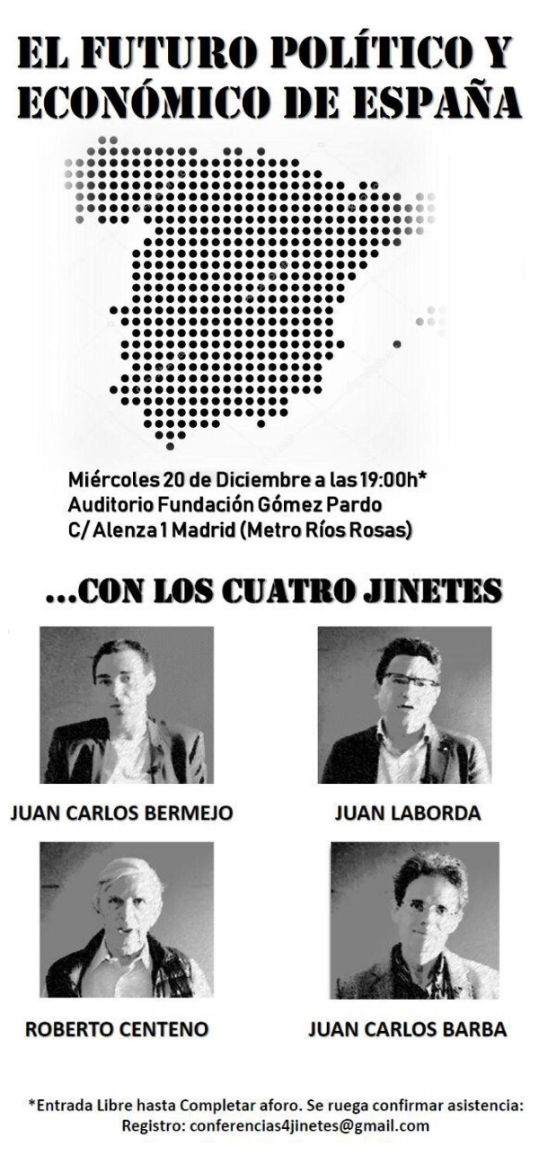 El próximo día 20 de diciembre, los analistas económicos y colaboradores de Colectivo Burbuja, Juan Laborda, Roberto Centeno, Juan Carlos Bermejo y Juan Carlos Barba participarán en un encuentro en Madrid. Abordarán los principales problemas económicos y políticos que enfrenta la sociedad española con la intención de proponer soluciones a los mismos. Os esperamos en el Auditorio de la Fundación Gómez Pardo en la calle Alenza, 1 (Madrid).